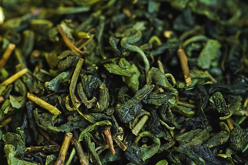 Thé vert Gunpowder, premières et secondes feuilles récoltées et roulées à la main, séchées avec les feuilles de menthe pour un mélange frais et corsé